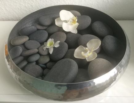 Basis sind die heißen Lavasteine, die auf ca. 55 °C in warmem Wasser aufgeheizt werden. Ich verwende orginale, nicht künstlich geschliffene Basaltsteine, da sie aufgrund ihres vulkanischen Ursprungs die Wärme ausgezeichnet speichern können. Diese Basaltsteine sind flach und wurden durch Wasser abgewaschen. Die scharfen Kanten sind dabei erodiert und nun rund, so dass sie keine Verletzungen hervorrufen können.